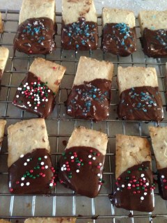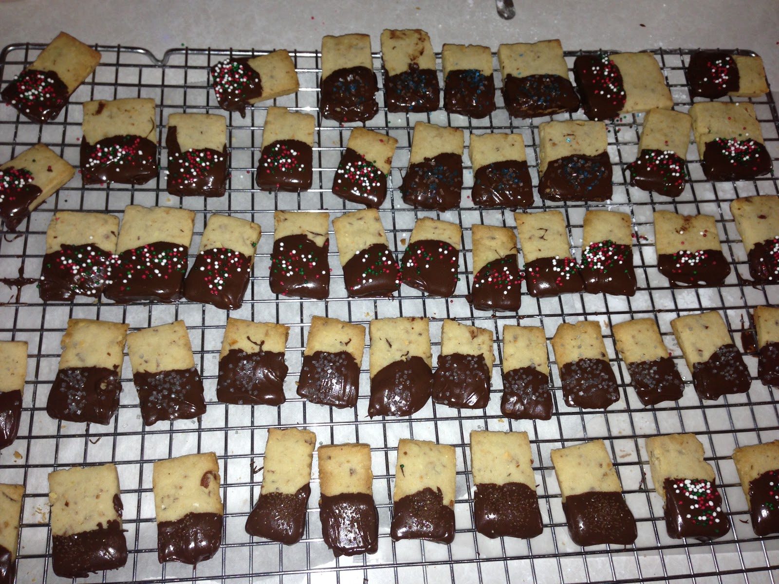 This also made a very crumbly dough, so I added a little water and melted butter to get it to the right consistency. Also, I used WAY more chocolate to dip than 2/3 cup. Oh, and then I put some pretty sprinkles on it.