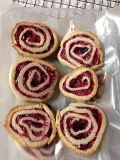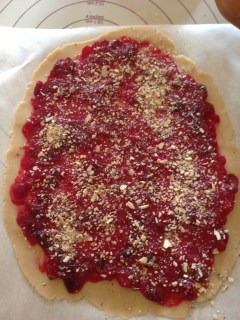 4. Roll dough into 12″x7″ rectangle on parchment paper. Spread cranberries and almonds on each rectangle and then roll each like a jelly roll. Wrap in parchment paper and chill for at least 2 hours (at this point it can be frozen.