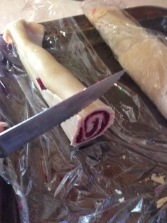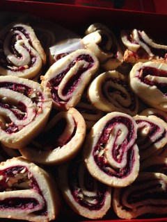 4. Roll dough into 12″x7″ rectangle on parchment paper. Spread cranberries and almonds on each rectangle and then roll each like a jelly roll. Wrap in parchment paper and chill for at least 2 hours (at this point it can be frozen.