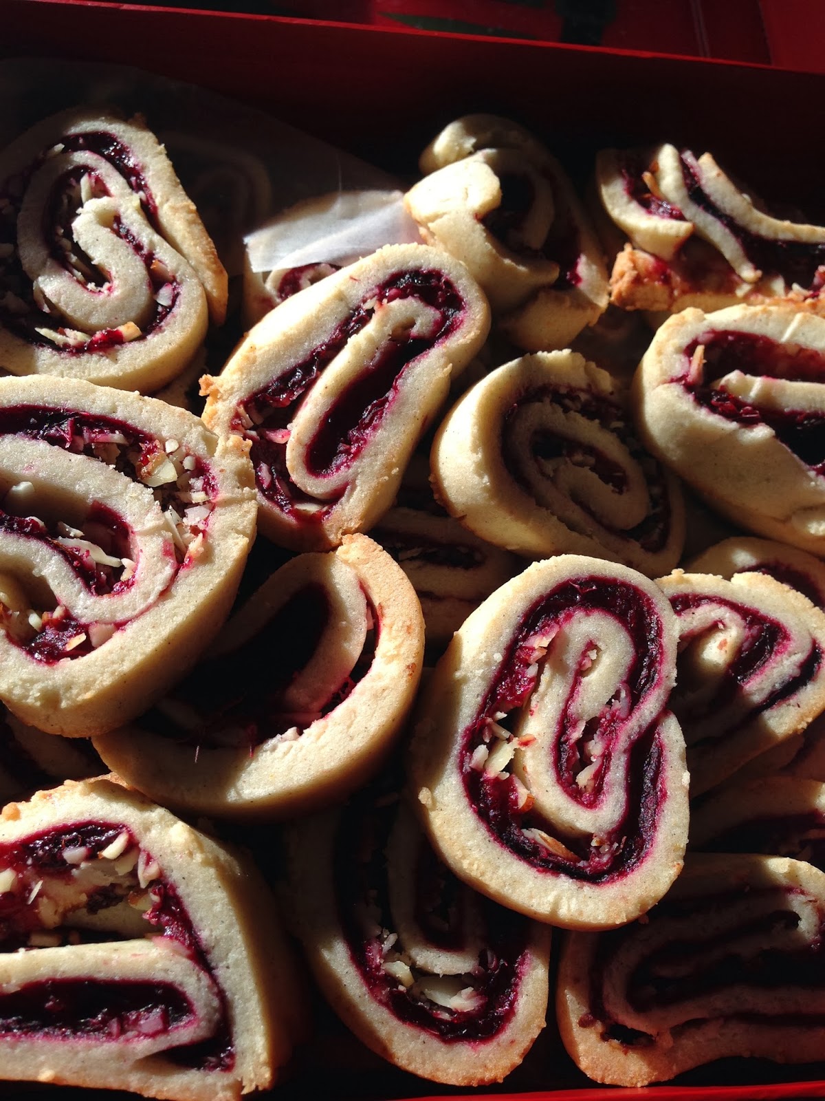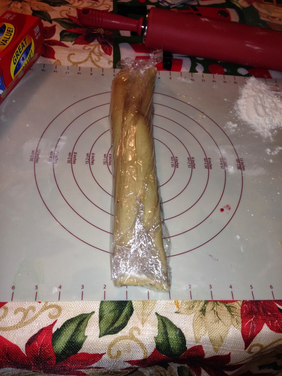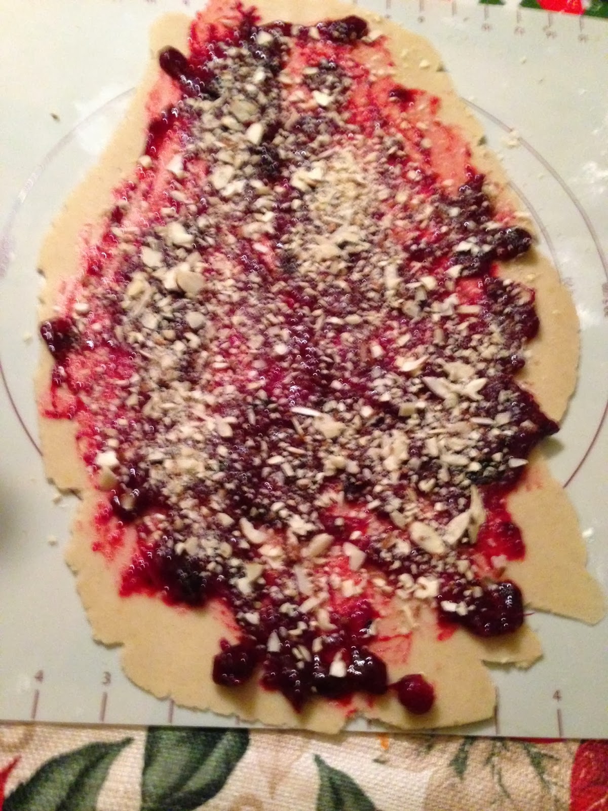 4. Roll dough into 12″x7″ rectangle on parchment paper. Spread cranberries and almonds on each rectangle and then roll each like a jelly roll. Wrap in parchment paper and chill for at least 2 hours (at this point it can be frozen.