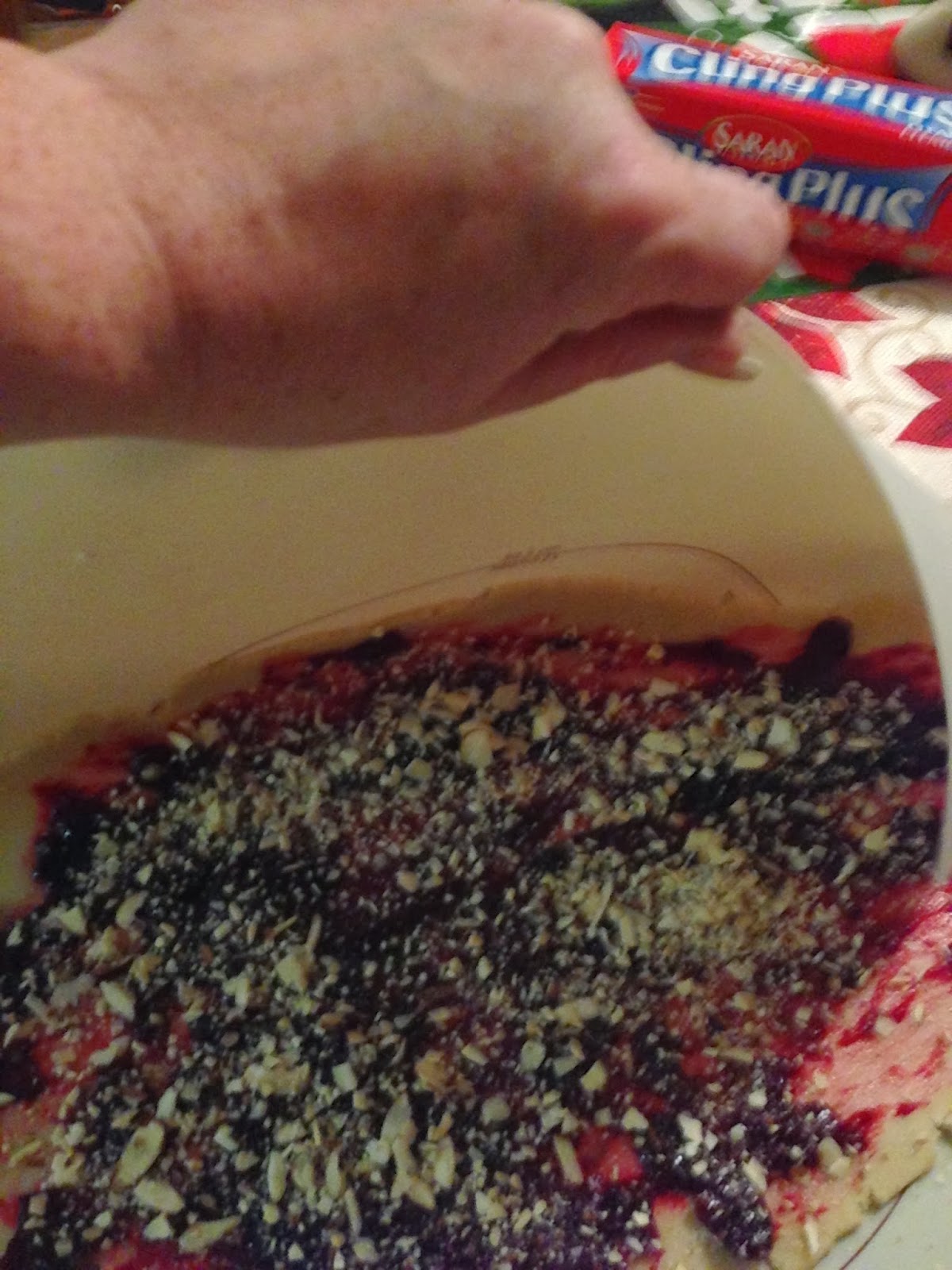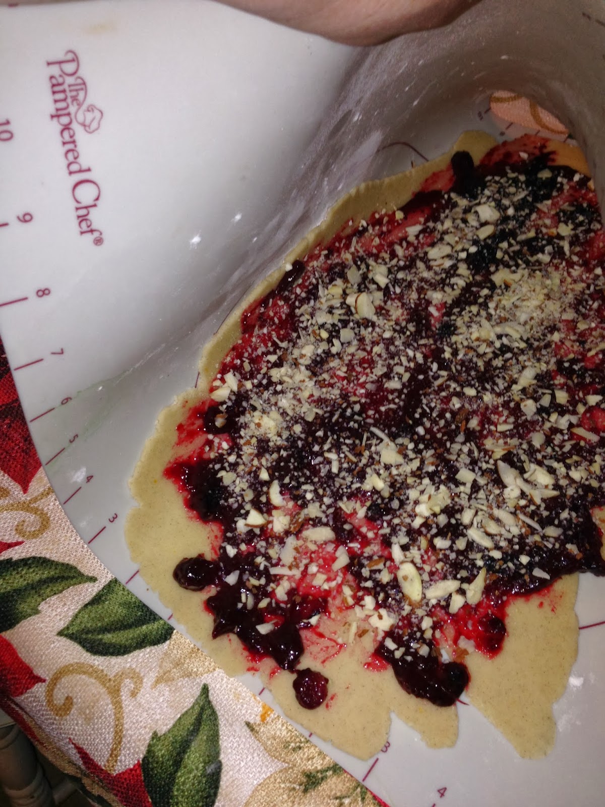 Oh well. It will still taste good. Spread the filling on top and add the almonds. Then roll it like a jelly roll. Please consult your grandma or great-aunt to find out what that means.