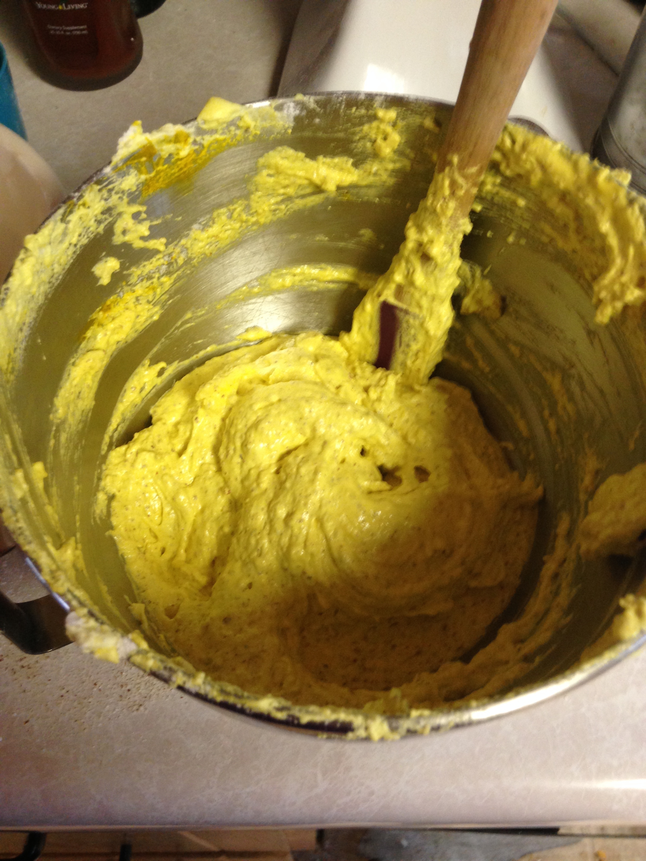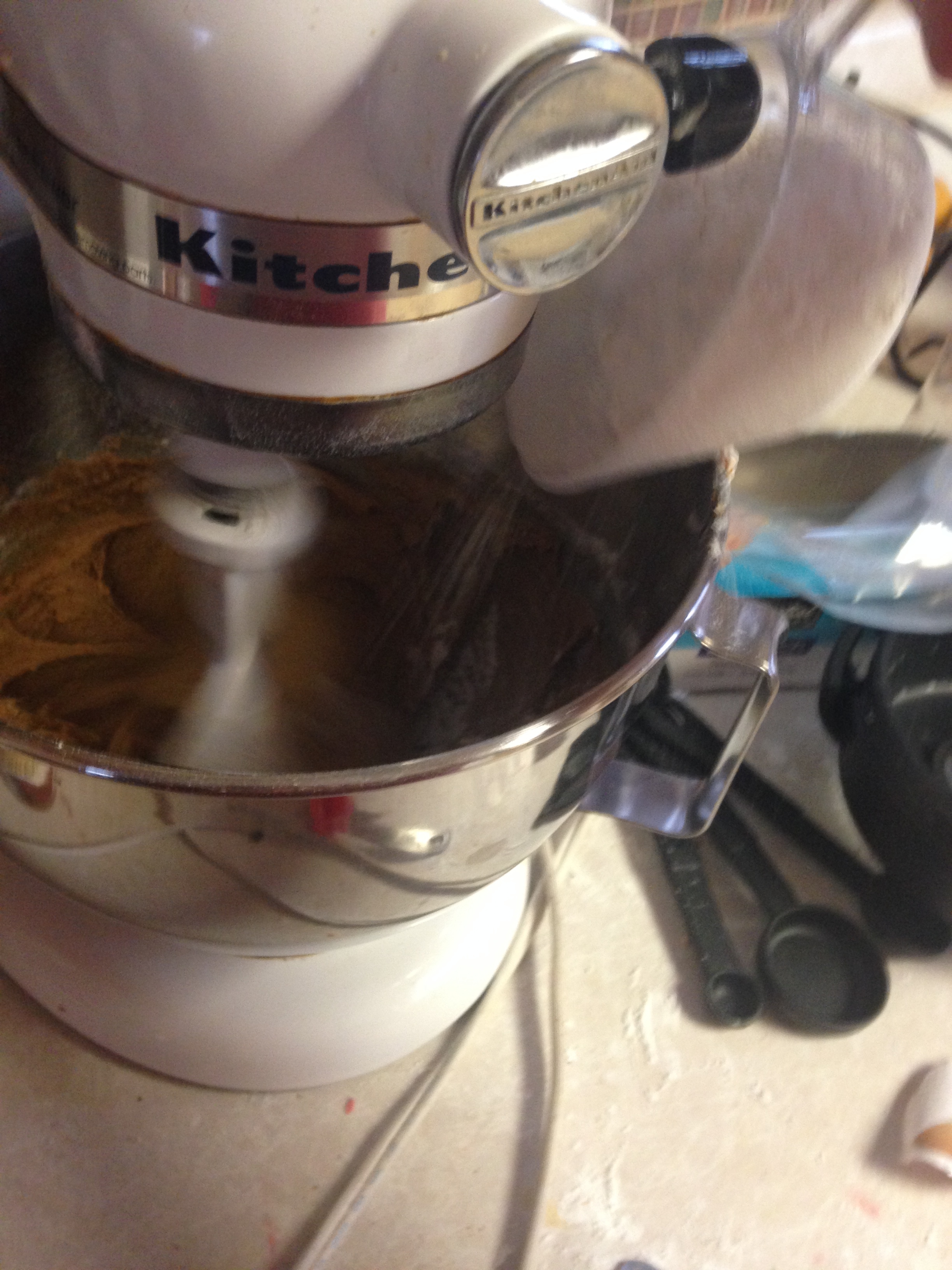 Once I add the molasses, sugar, and egg, I get my gingerbread voodoo spices out and go to work. Spices and baking soda goes in, and then the flour. Most people would stop the mixer to add things.