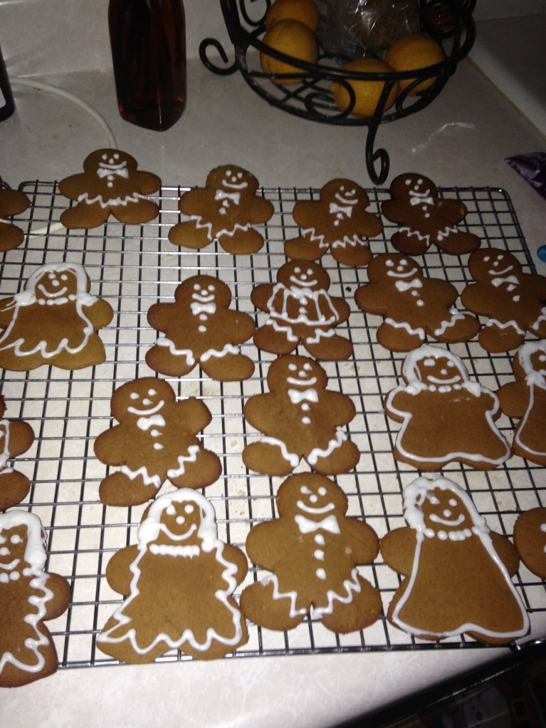 Once they are cooled, you can decorate them. I use a Wilton bag and a small round tip. Sadly, this year I didn’t make any anatomically correct gingerbread people because my kids were home. I mean, not that I’ve ever made them in the past…