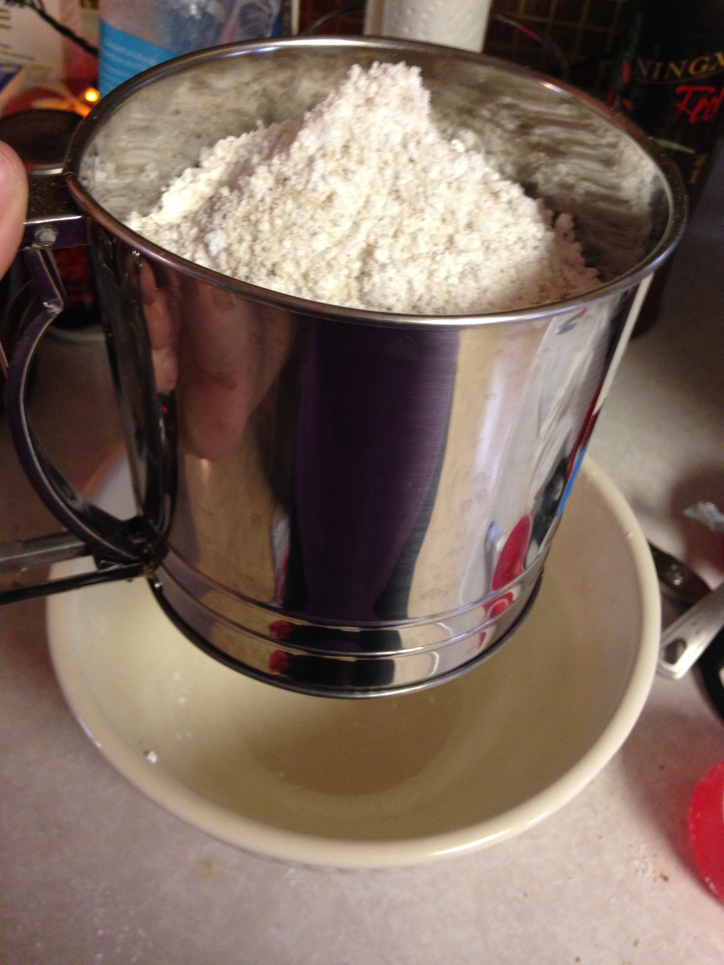 (What this picture doesn’t show is that I had to switch to a metal strainer because the use of my dominant hand would be something I’d like to keep this holiday season. This is a heavy mixture, and I discovered quickly that I couldn’t pull the handle that many times.)
