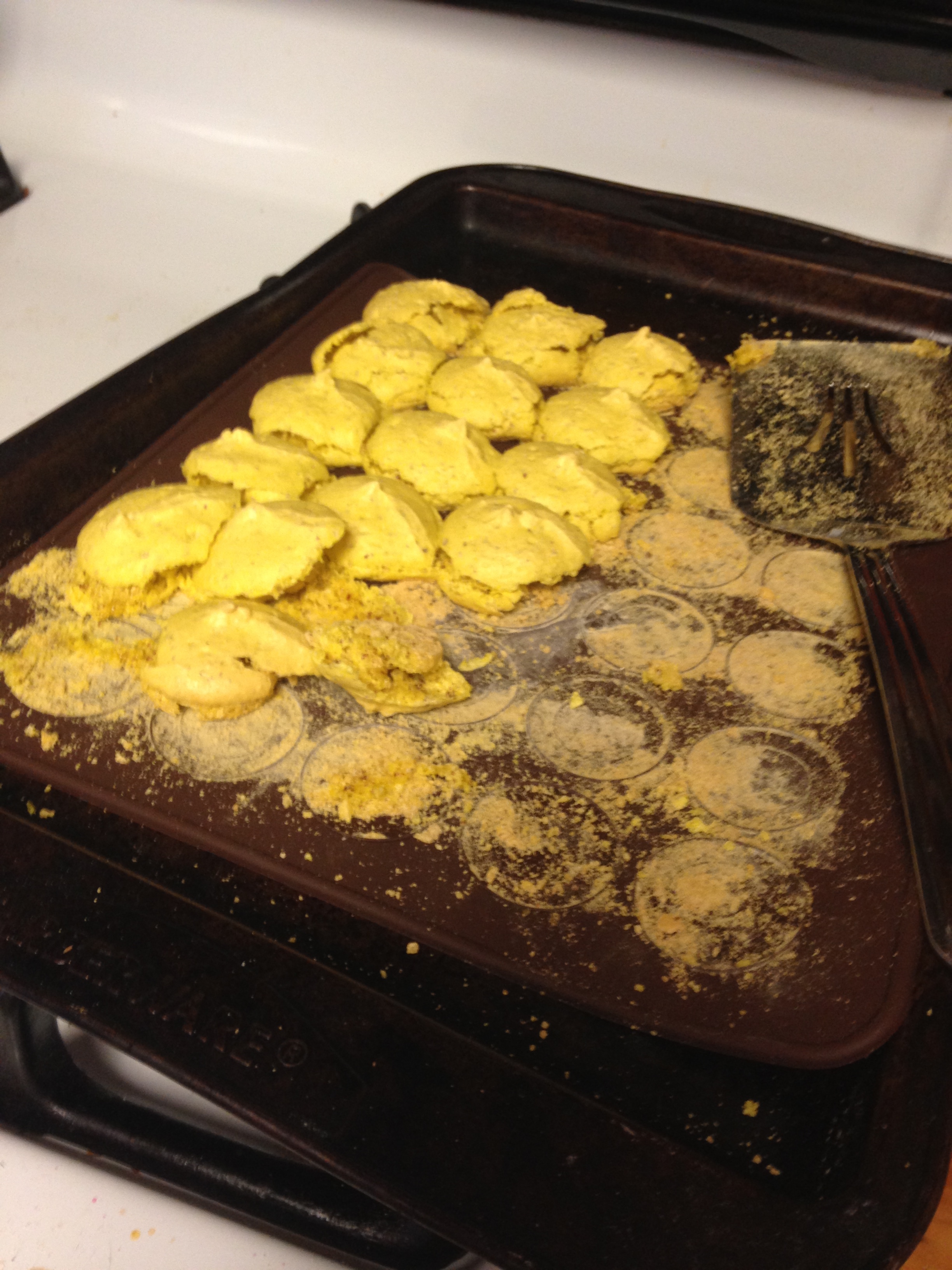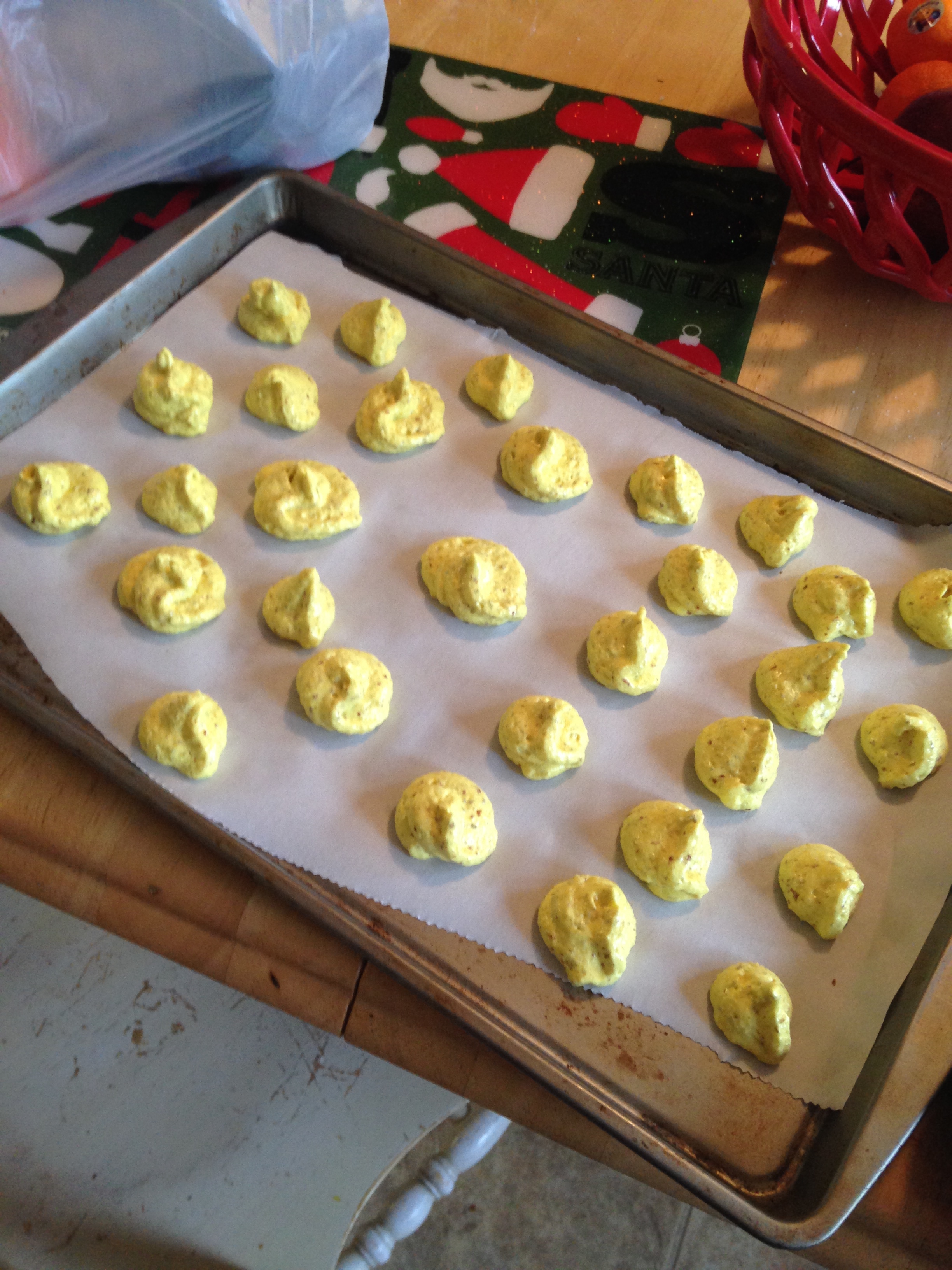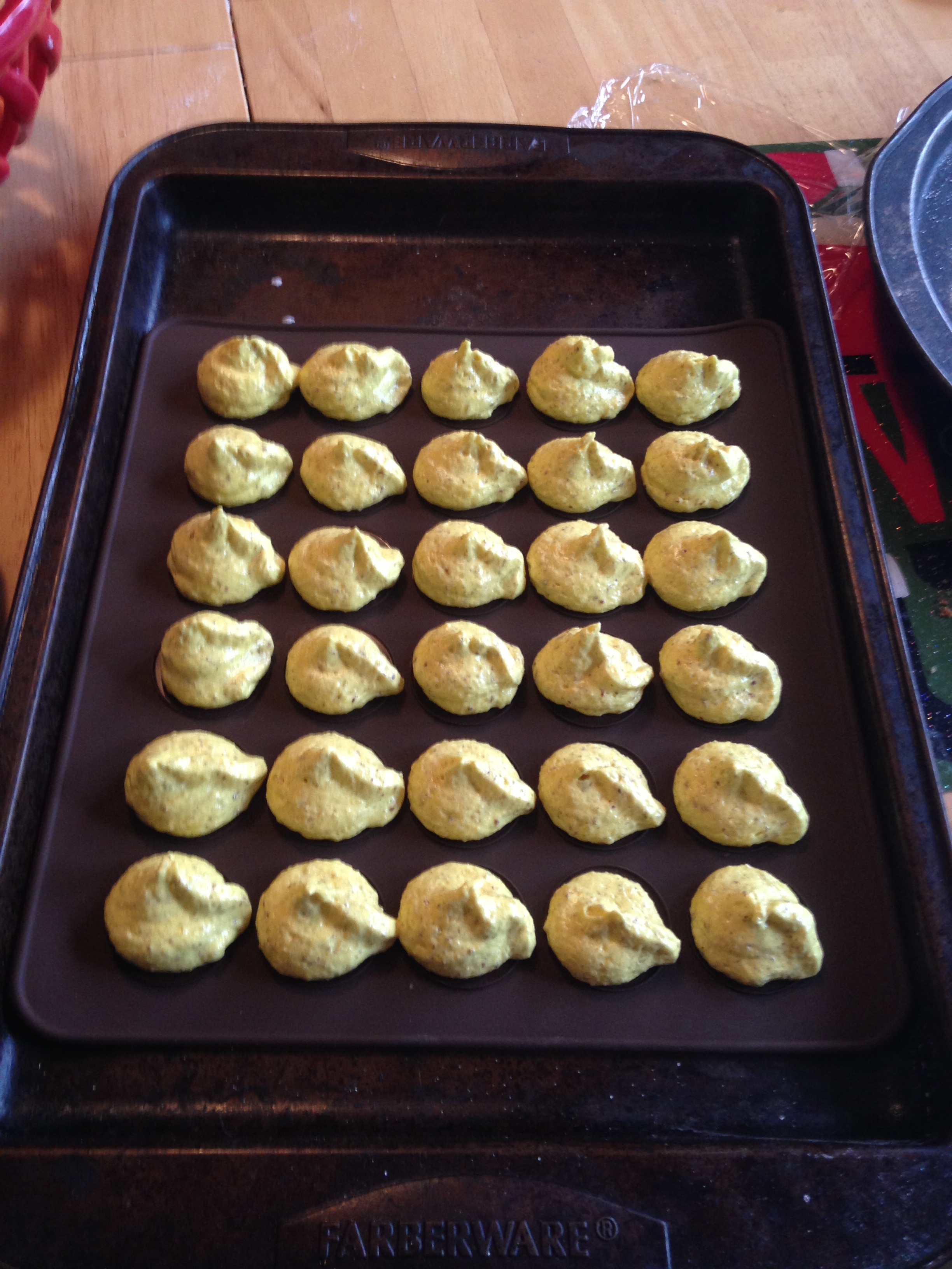 And forced it through a pastry bag and plopped drops on my silicone macaron sheet, and then on another pan but on parchment paper.