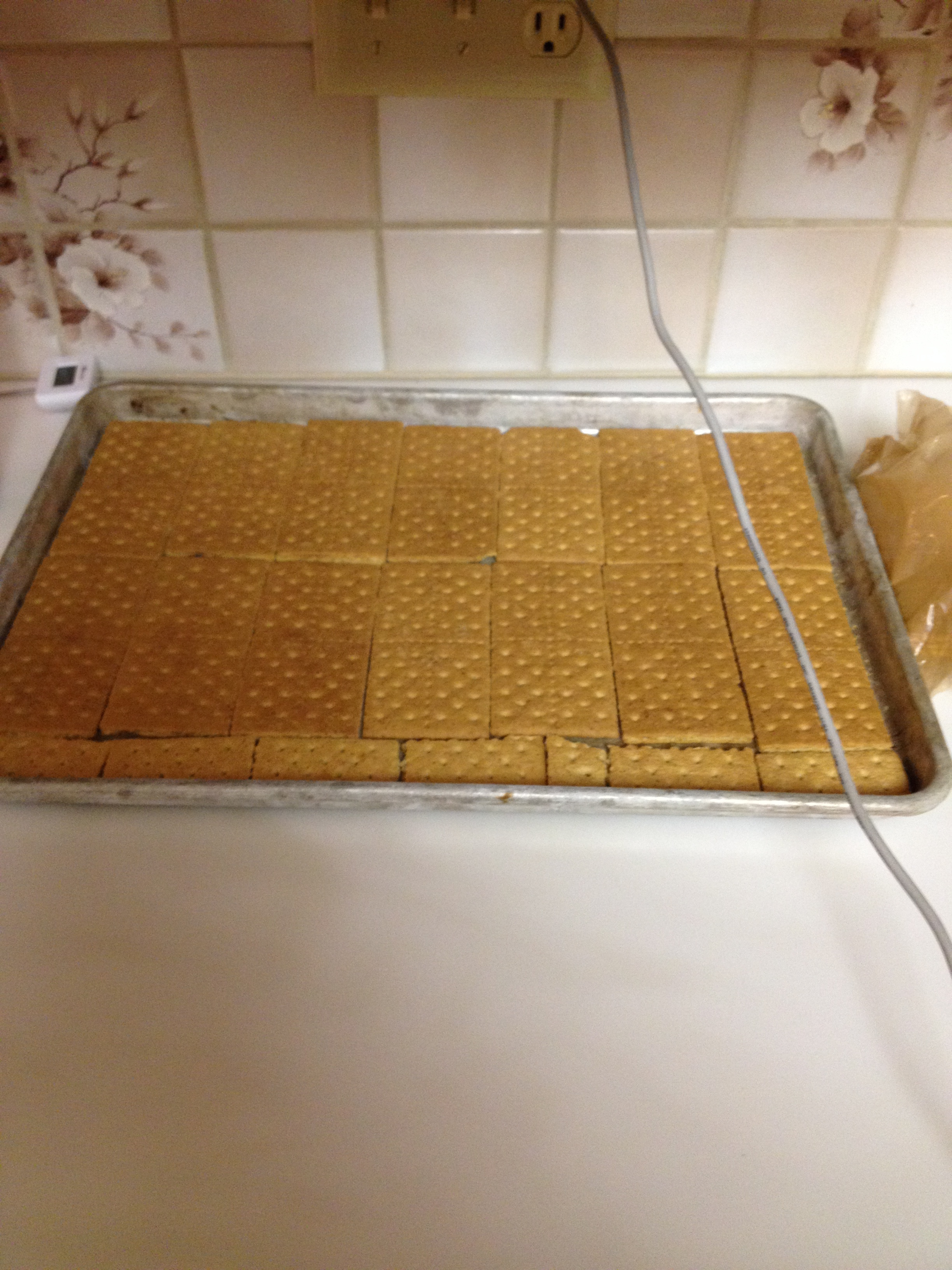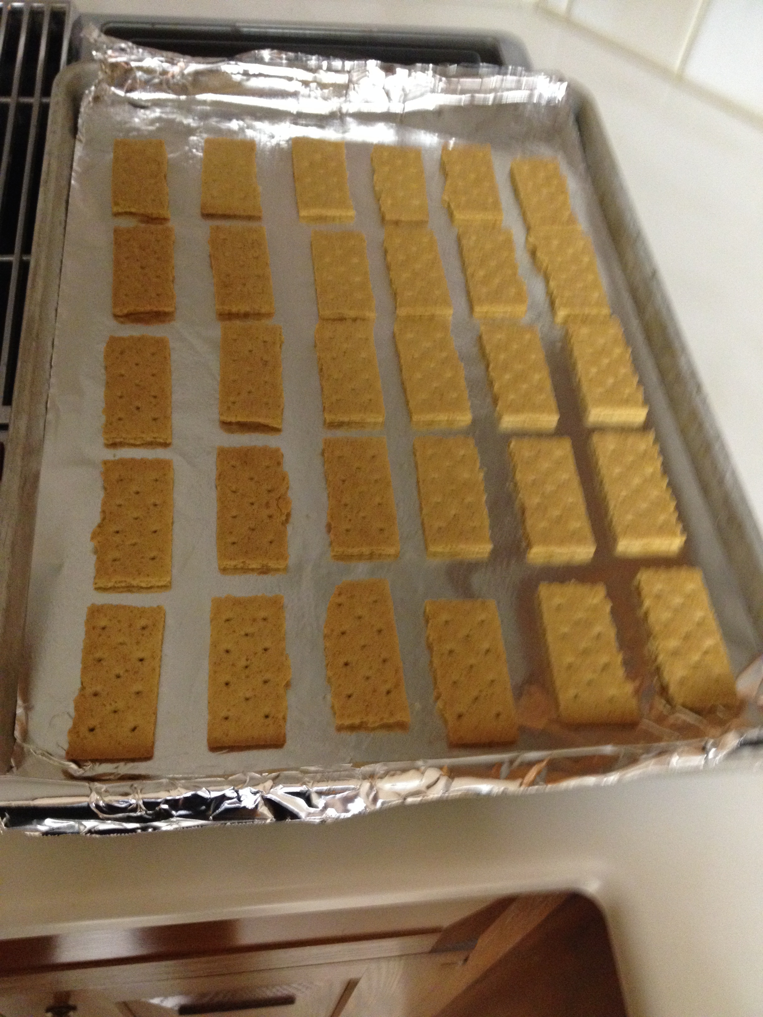 I gently explained to her that the graham crackers needed to be “wall-to-wall” on the cookie sheet and that she may not want to use tin foil.