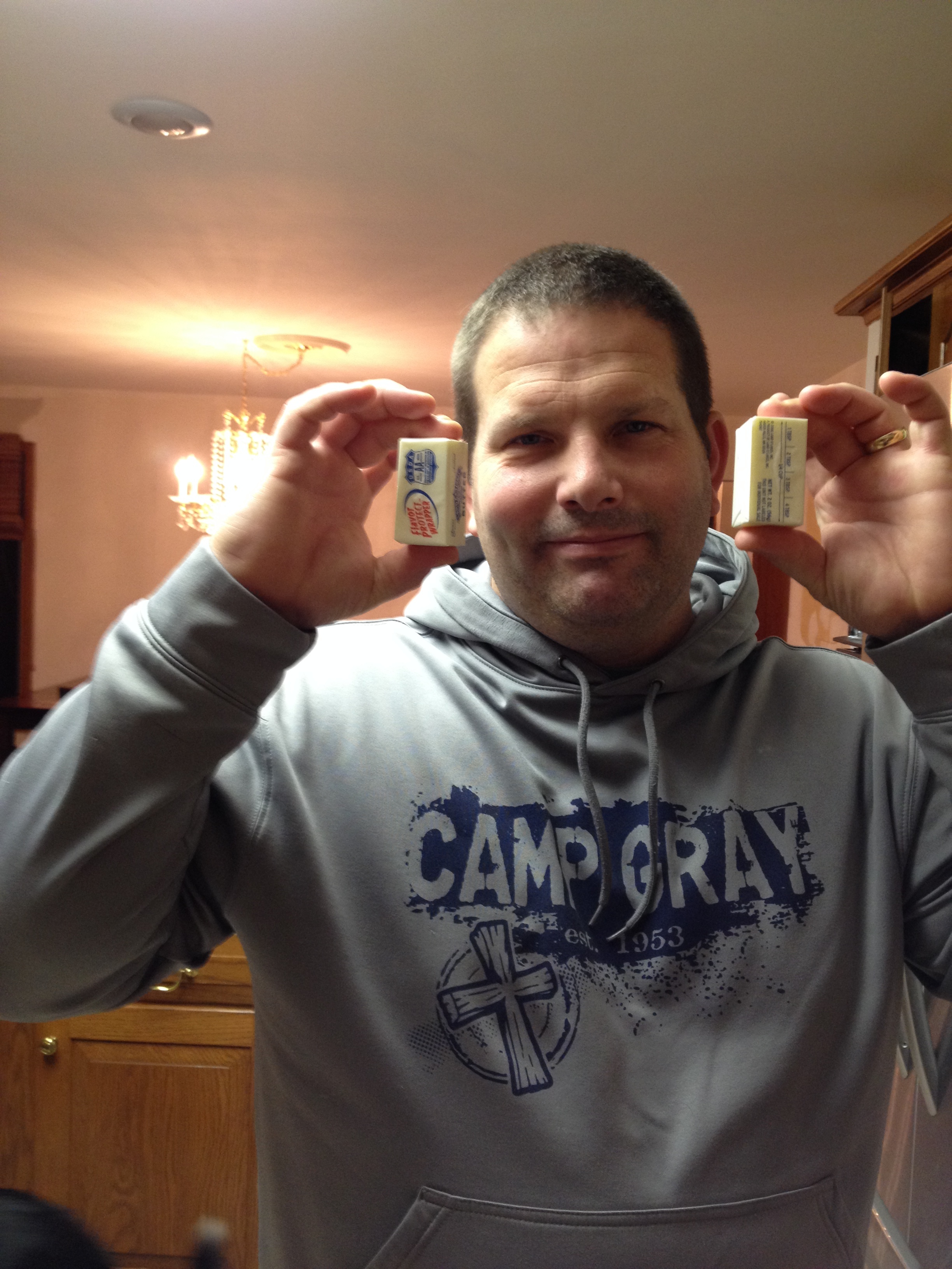 Then, because I’m apparently the crazy one, she sent me this picture of her husband with said short sticks of butter.