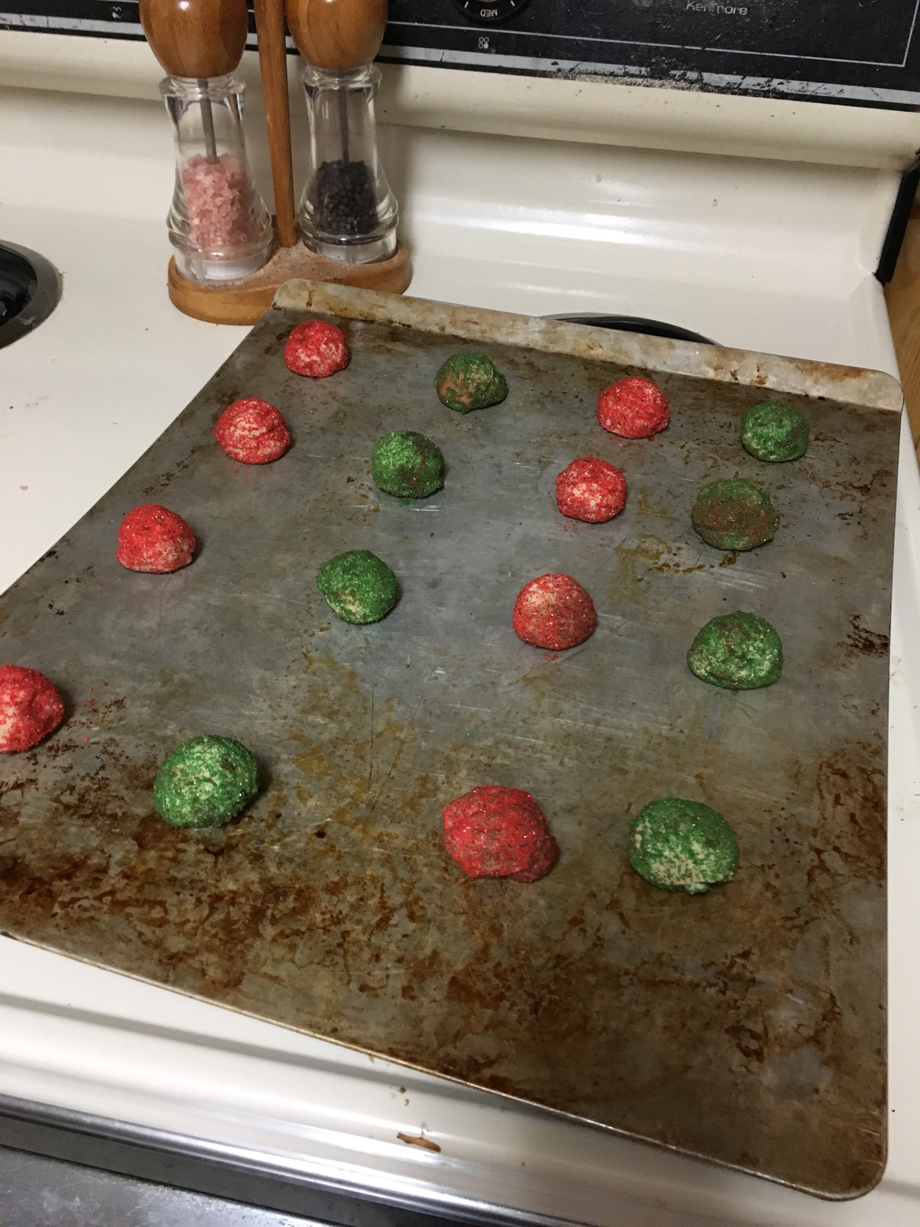 Because I love you all and want to make a good impression right now, I put them on my cookie sheet in alternating order. So pretty, but truth be told, after I snapped this picture, it was every colored-cookie for themselves. I don’t have time to prettify my cookie sheets.