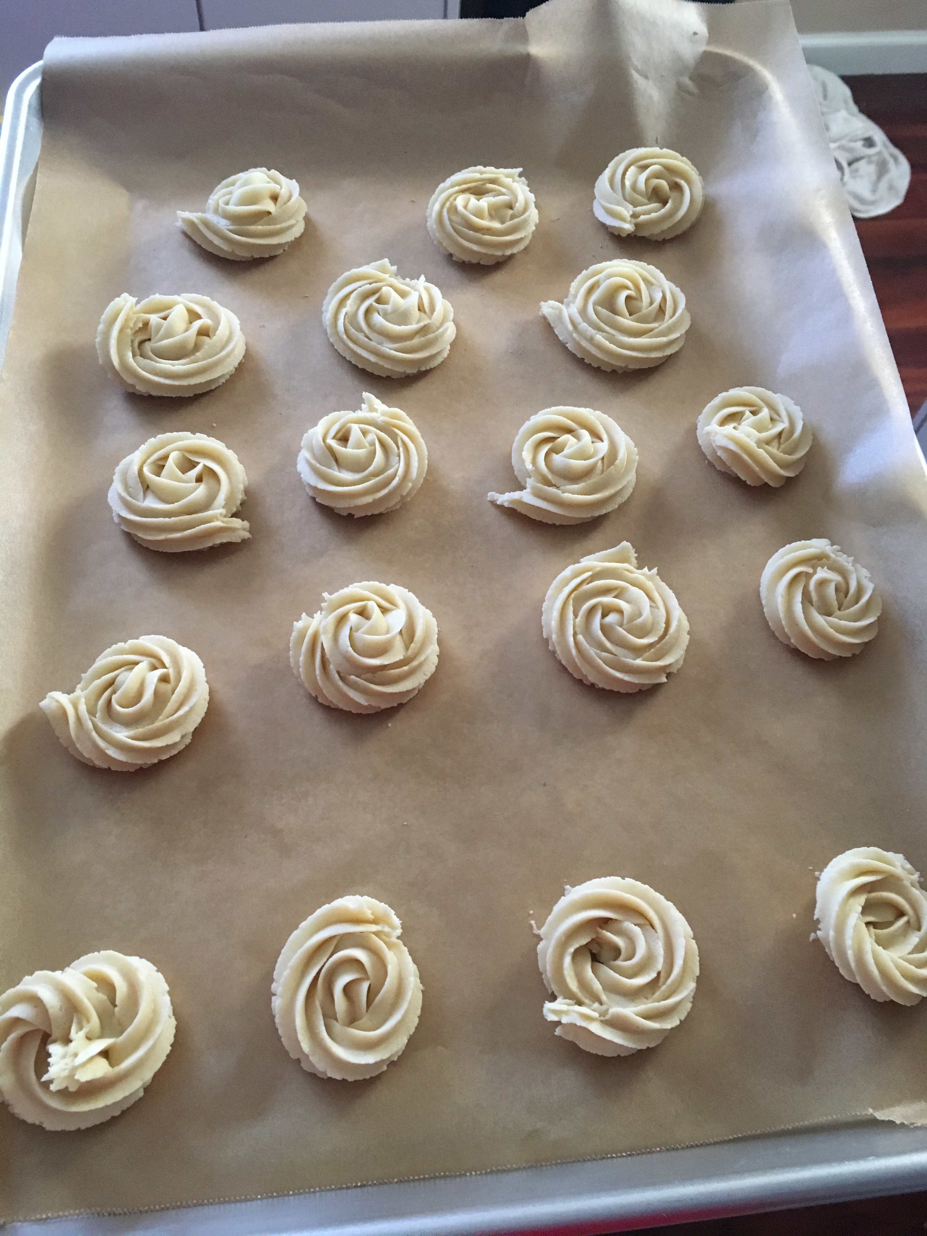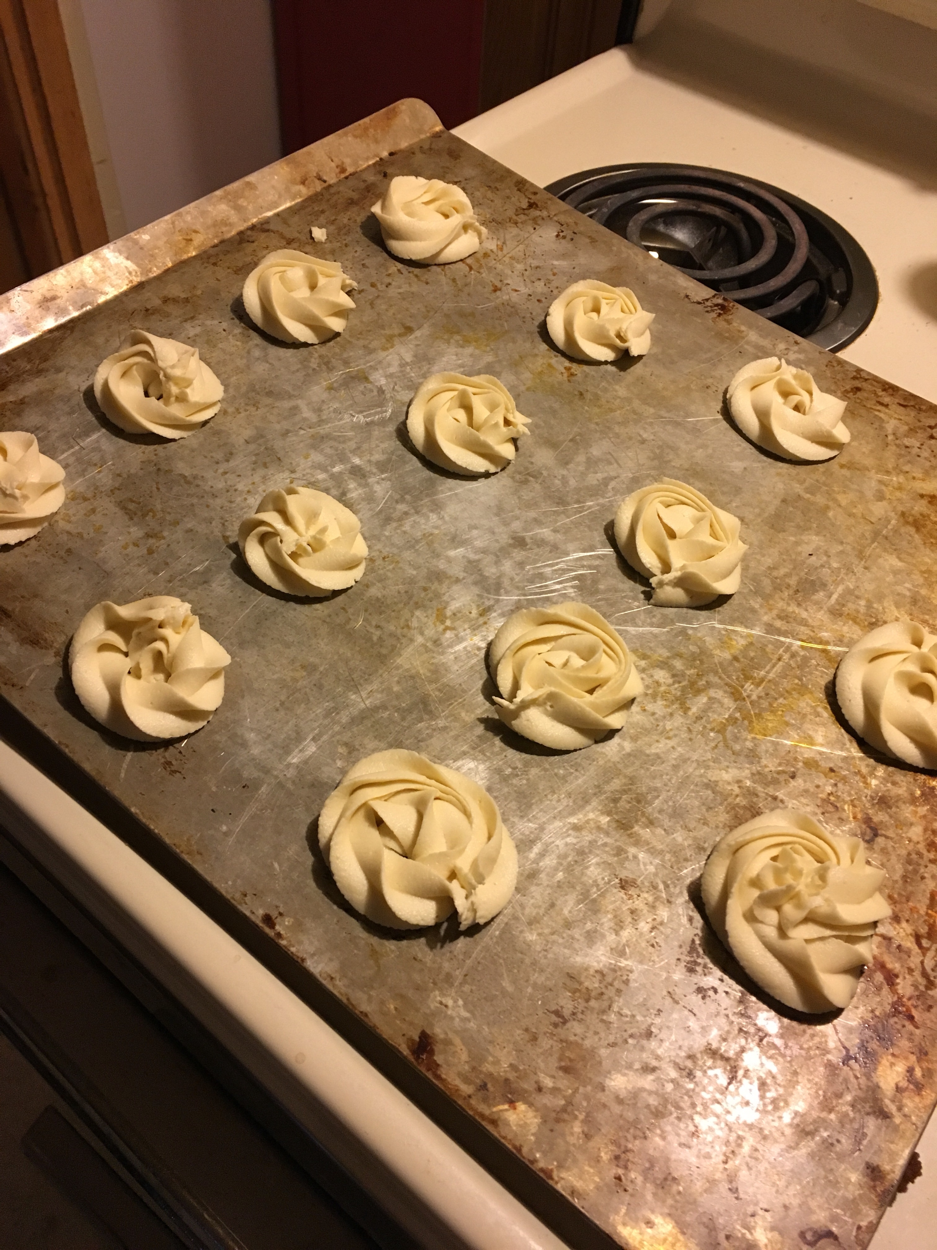 Mixed it all together and piped it on a cookie sheet (I also didn’t have parchment paper, which I discovered after I got home from the store for the second time today. I was not about to return for a third.)