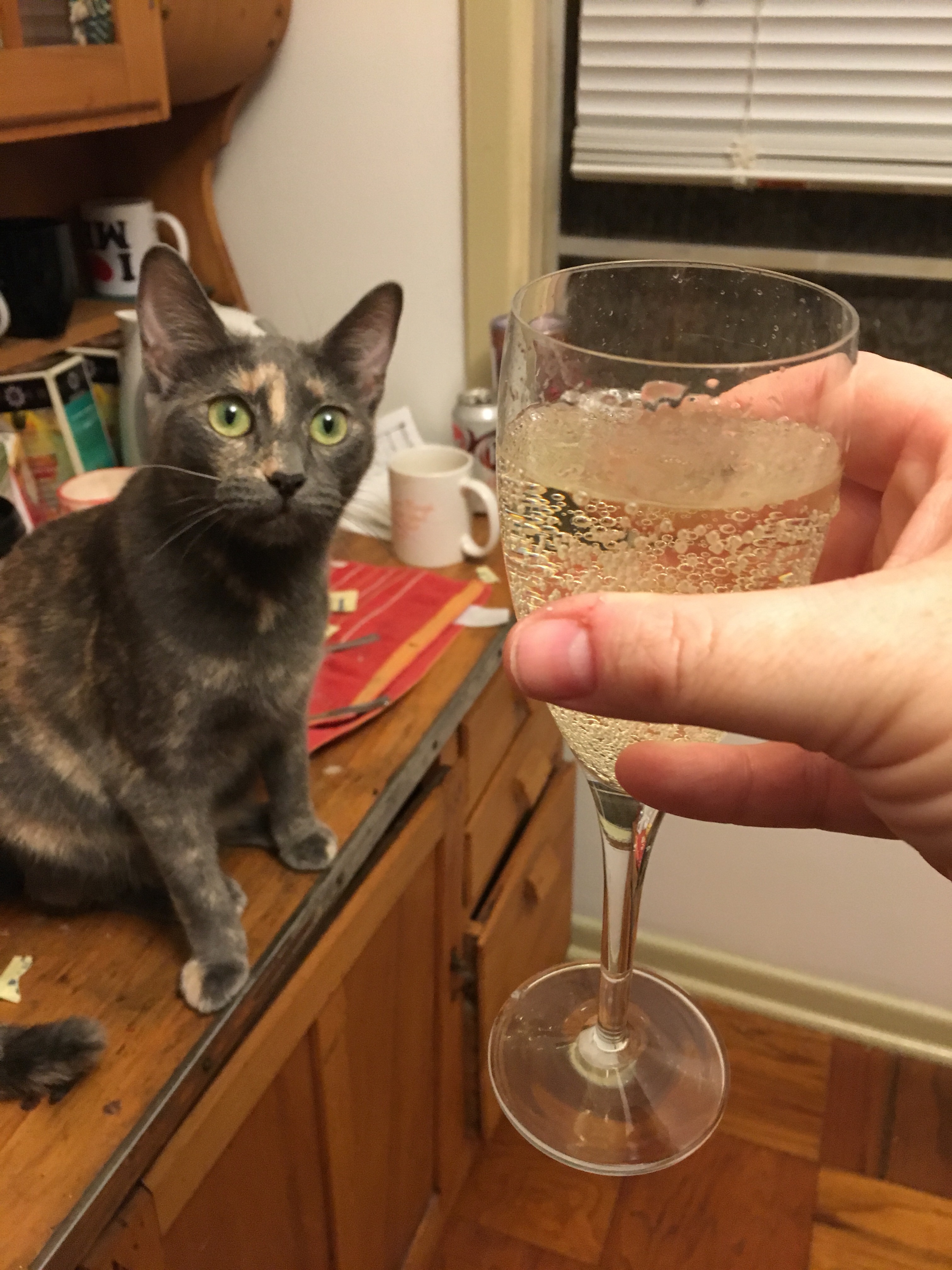 No, not the cat. That’s Zelda, and she’s a new addition. I’m talking about the glass of Prosecco, also a new addition of sorts.