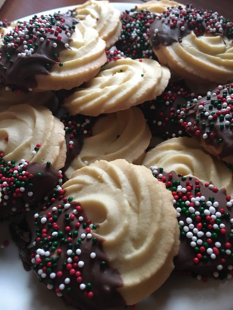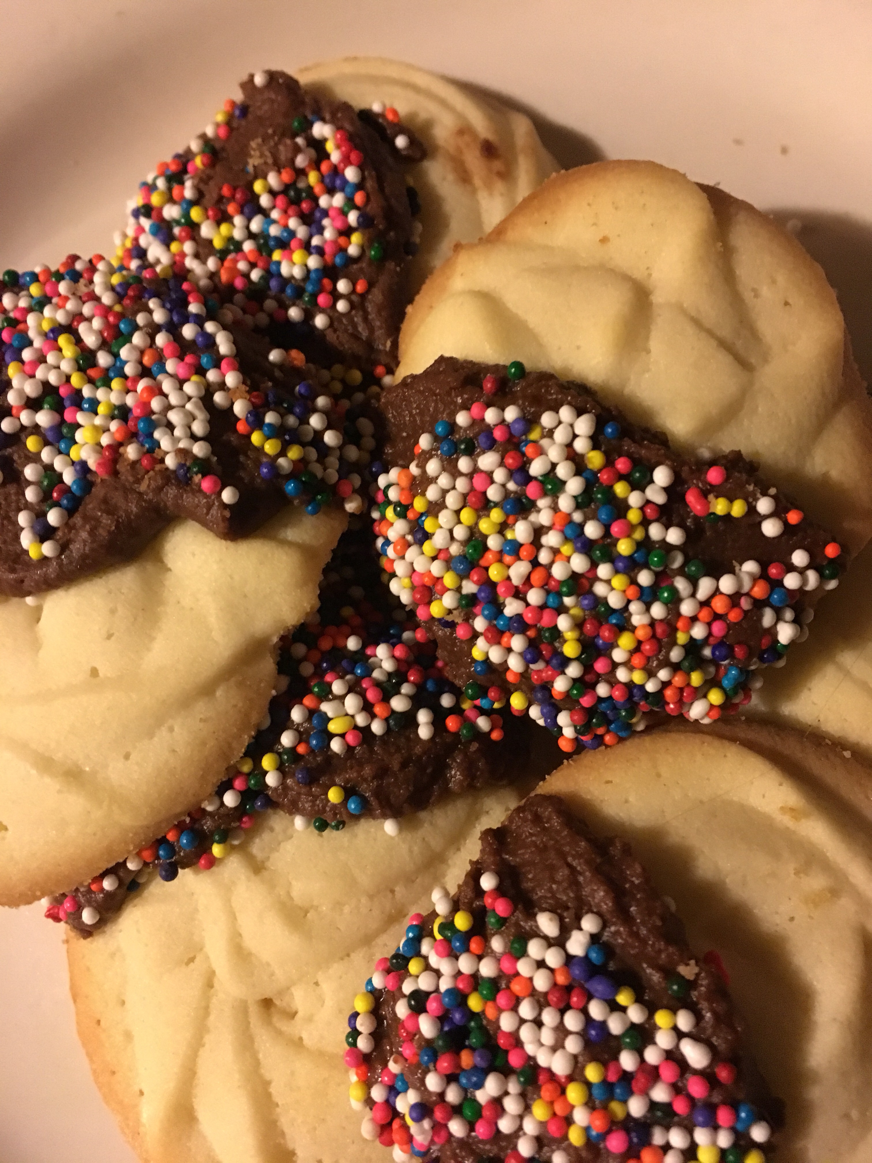 So, in making these, I realized too late that I was out of my traditional red, white, and green sprinkles. So, the Italian Sand Cookies this year represents my vast sprinkle collection. Well, at least the ones that show up on chocolate.