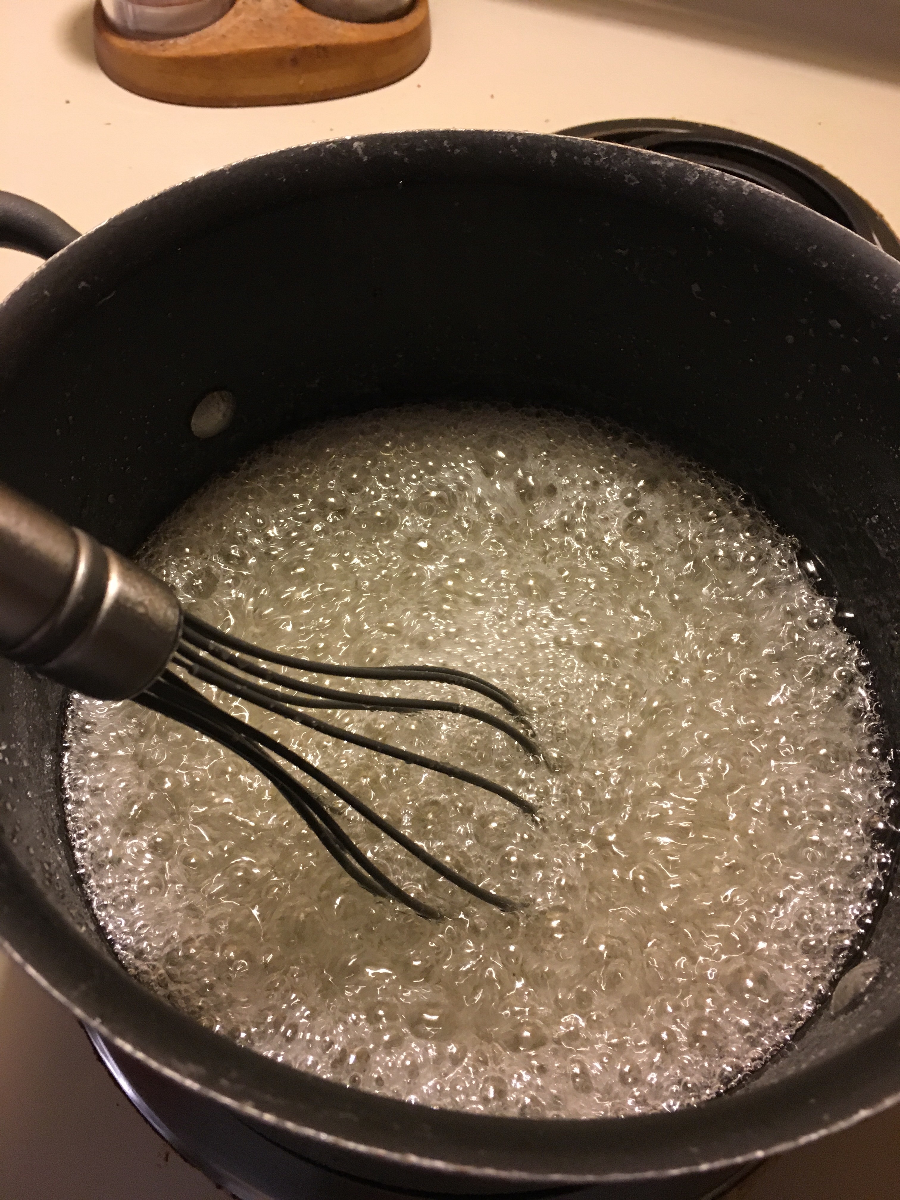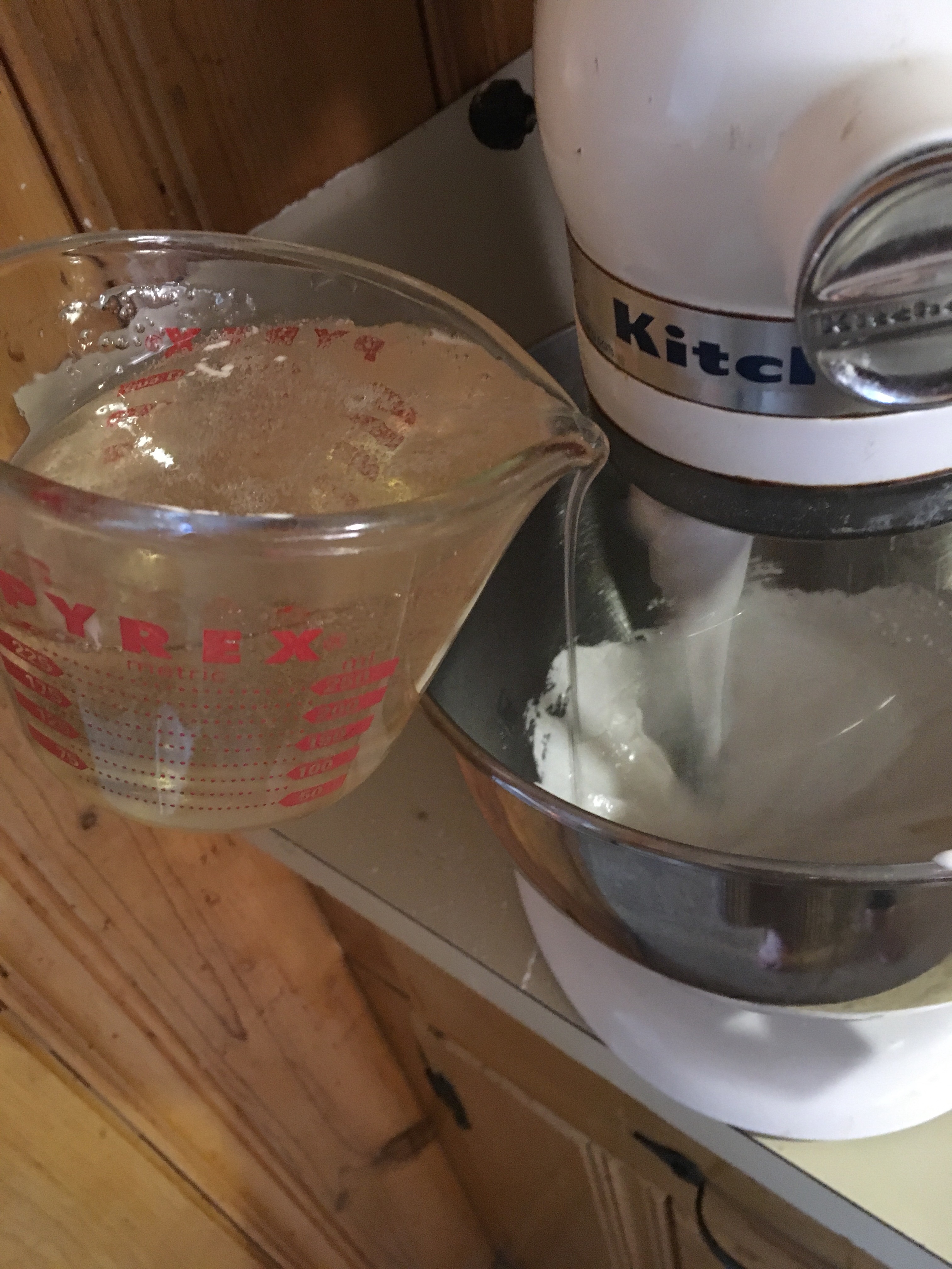 And the mess begins. Because this recipe calls for more corn starch than I used to use in battling my kids’ diaper rash, it got a little out of hand. And cup. And counter. I’ve clean it all up three times now, and I’m still slipping on the floor where it happened.